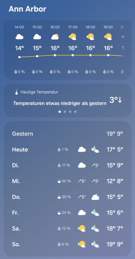 Nach 2 Stunden Bahnfahrt, 9 Stunden Flugzeit und einer halben Stunde Autofahrt glücklich im regnerischen Ann Arbor angekommen.